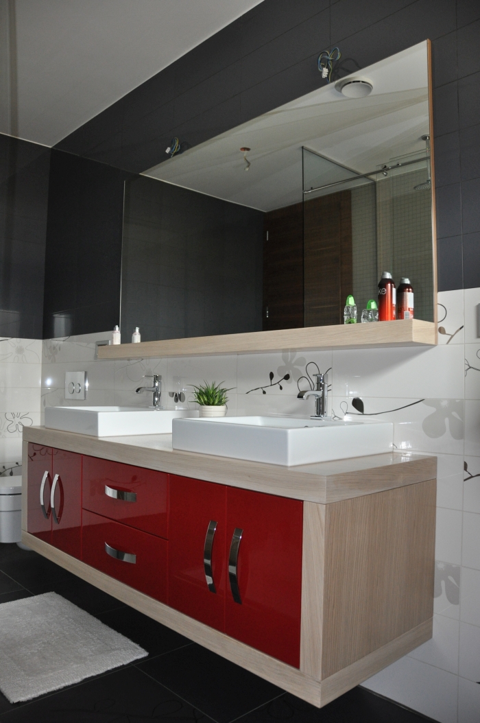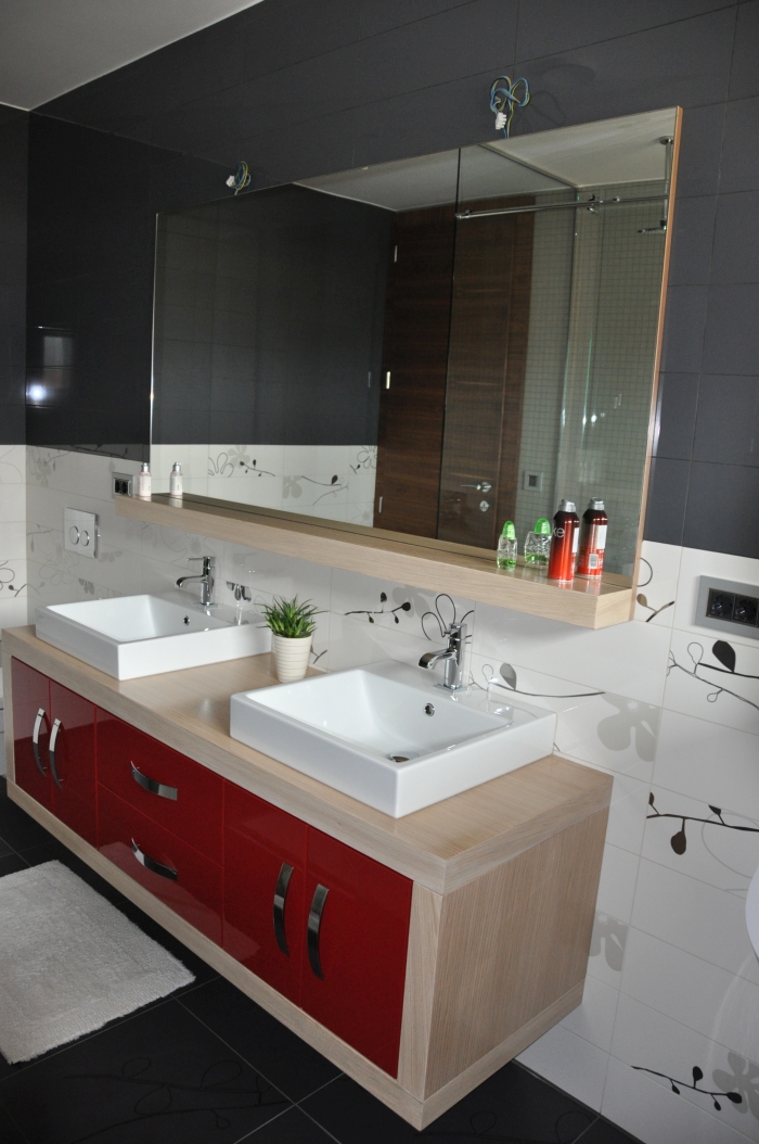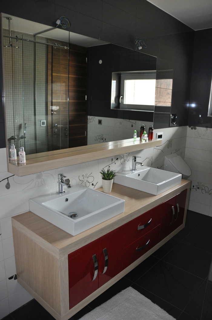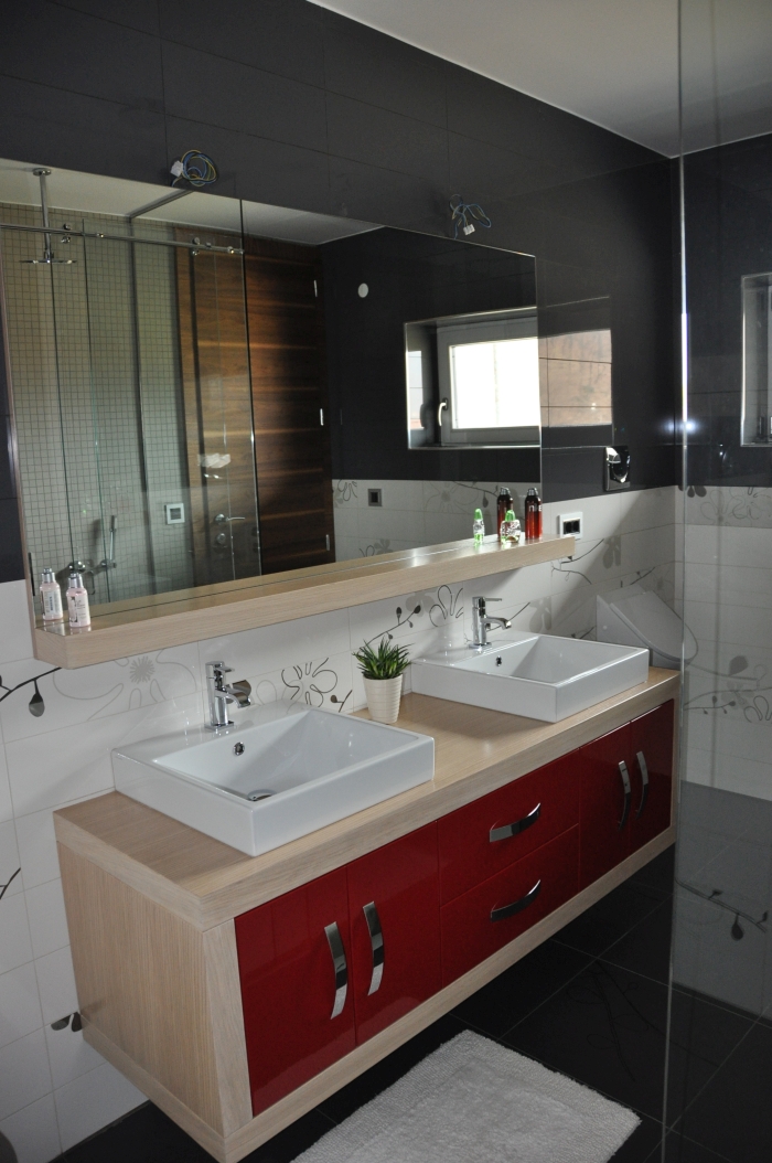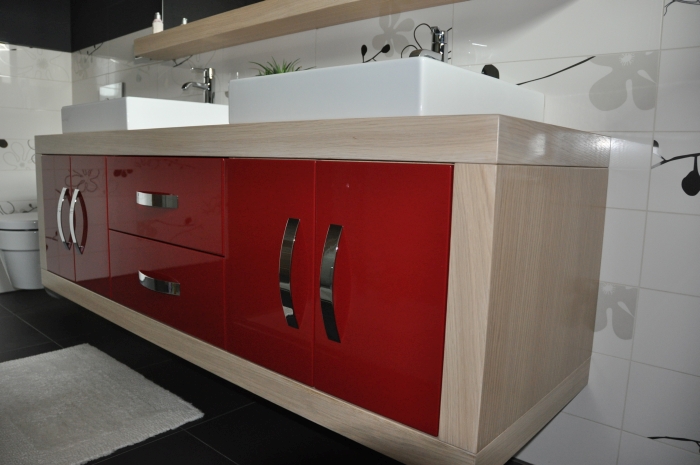 • Vrata in ličnice v bordo rdeči barvi MDF, visoki sijaj