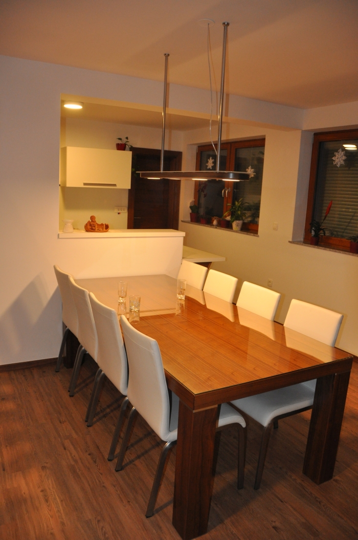 - Svetli del kuhinje in pulti: bel ultrapas, ki ima tudi belo sredico – daje izgled monolitnega kosa