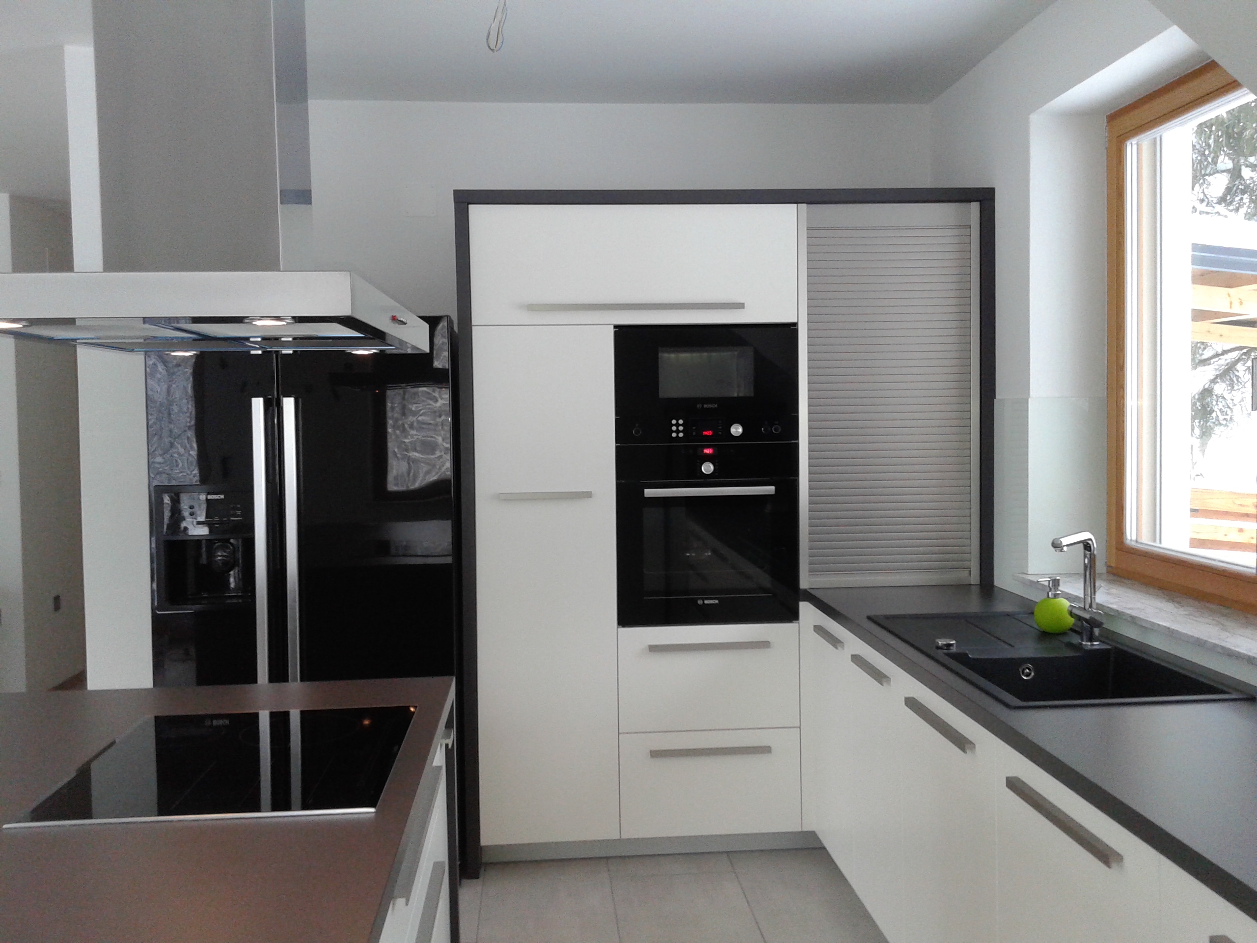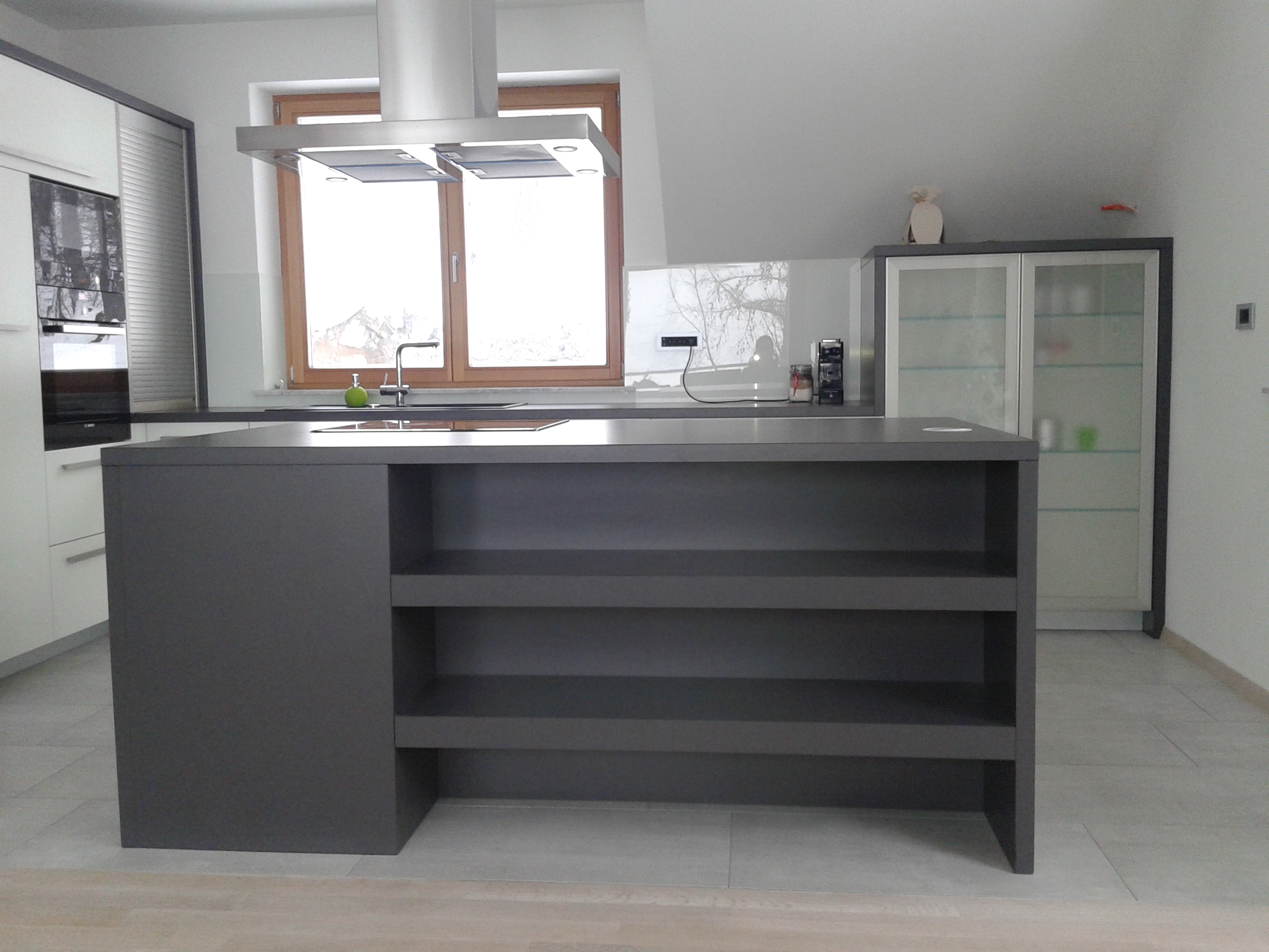 - Sivi del kuhinje je iz grafitno sivega ultrapasa (Fundermax) v kombinaciji z belim iveralom z ABS nalimki