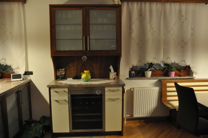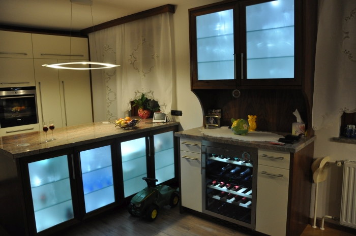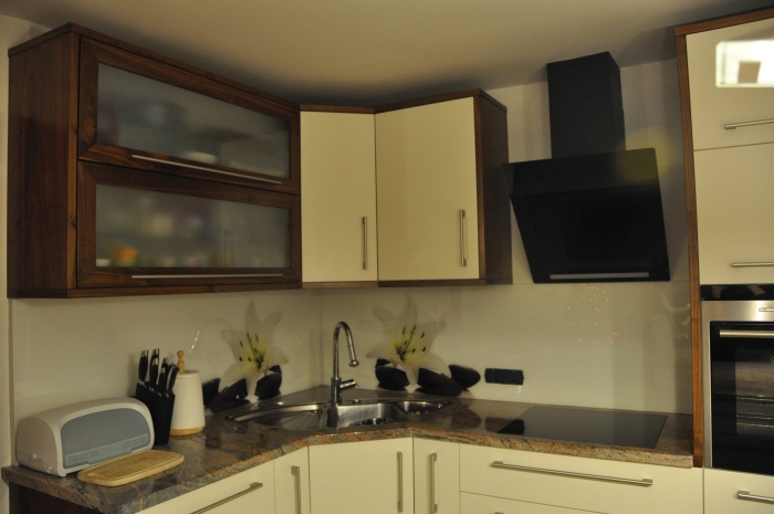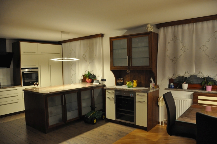 - Kuhinja je narejena iz belega barvanega MDF-a v kombinaciji z ameriškim orehom