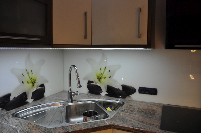 - Steklen kuhinjski pas s foto tapeto proizvajalca Vemplex
