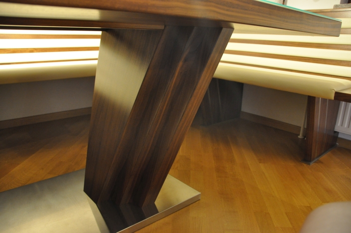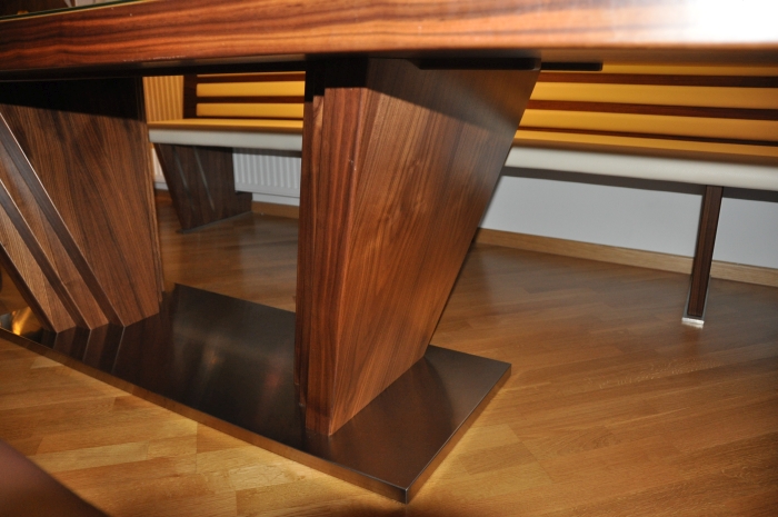 - Miza je narejena iz furnirja ameriškega oreha z masivnimi orehovimi nalimki