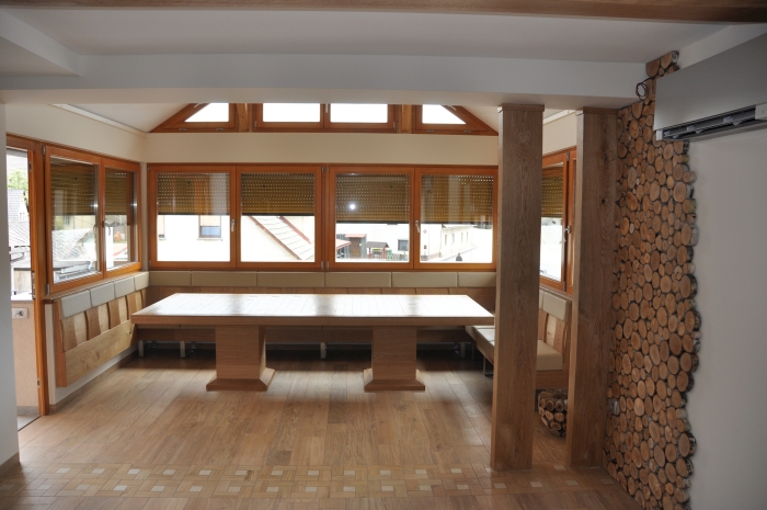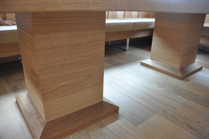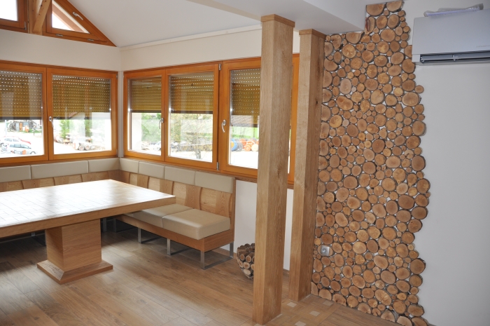 - Jedilna miza in klop sta narejeni iz hrastovega furnirja v kombinaciji z masivo – krtačeno in lakirano z mat lakom