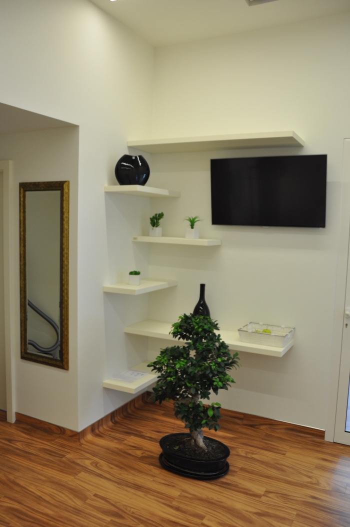 - Police v čakalnici so na steno pritrjene z nevidnimi nosilci in imajo vlogo popestritve le-te