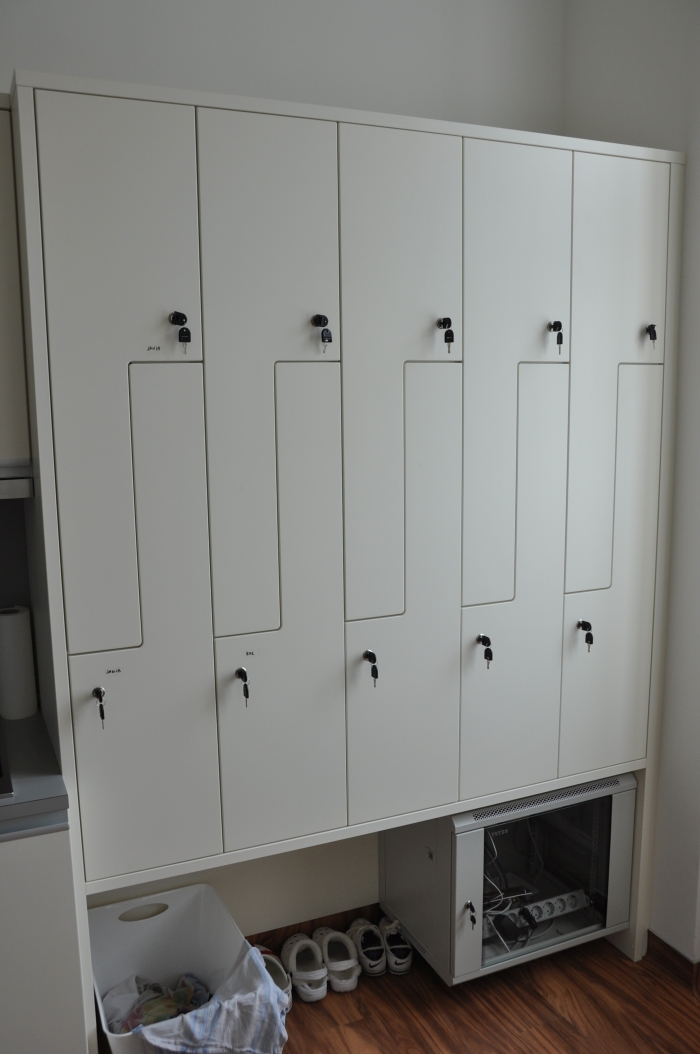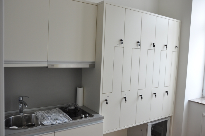 - Čajna kuhinja in garderobne omarice so iz belo barvanega MDF-a