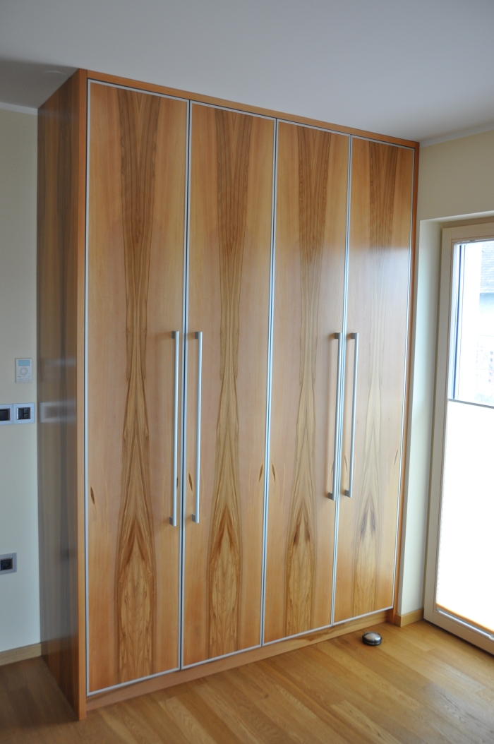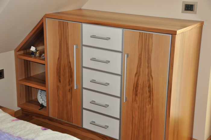 - furnir oreh satin v kombinaciji z umazano belo barvanim MDF
